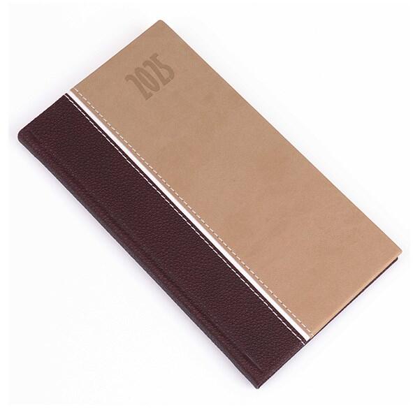 Fehér papíros, cérnafűzött, heti beosztású fekvő zsebnaptár, 144 oldalas, sarokperforált.